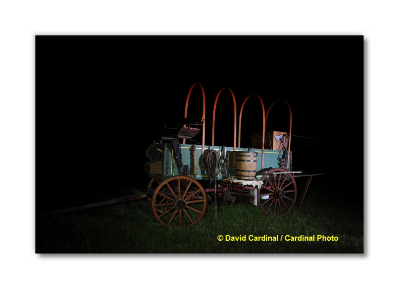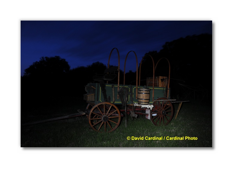 So I simply took the very first images I captured—where the twilight still held sway in the sky—and combined them with our later images where we painted with flashlights and even backlit with an SB-900, using PhotoMatix Pro to create an image depicting both the colorful detail of the wagon and the blue of the sky: